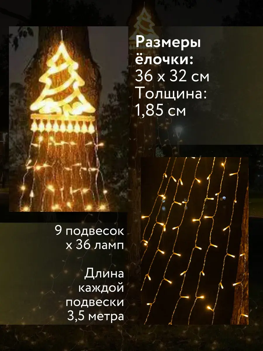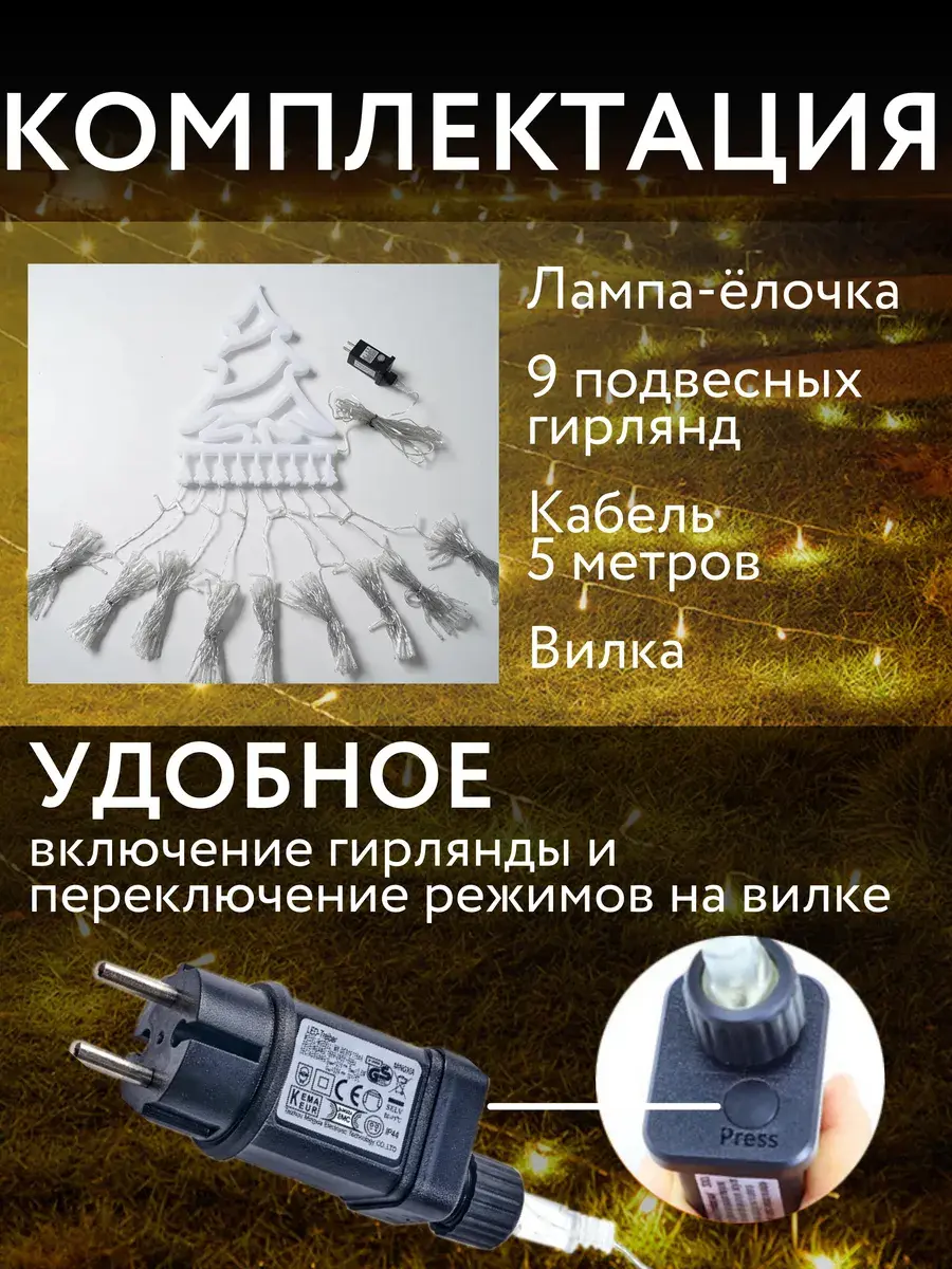 постоянный свет, волна, последовательность, мерцание/вспышка, следящий свет/вспышка, медленный свет, затемнение. Вы можете выбрать то, что подойдет именно для вашего интерьера или оформления. Во главе электрогирлянды - елочка, фиксирующая 9 подвесок из 36 ламп, длина каждой нити 3,5 метра. Удобное включение и переключение режимов на вилке, работает от сети.