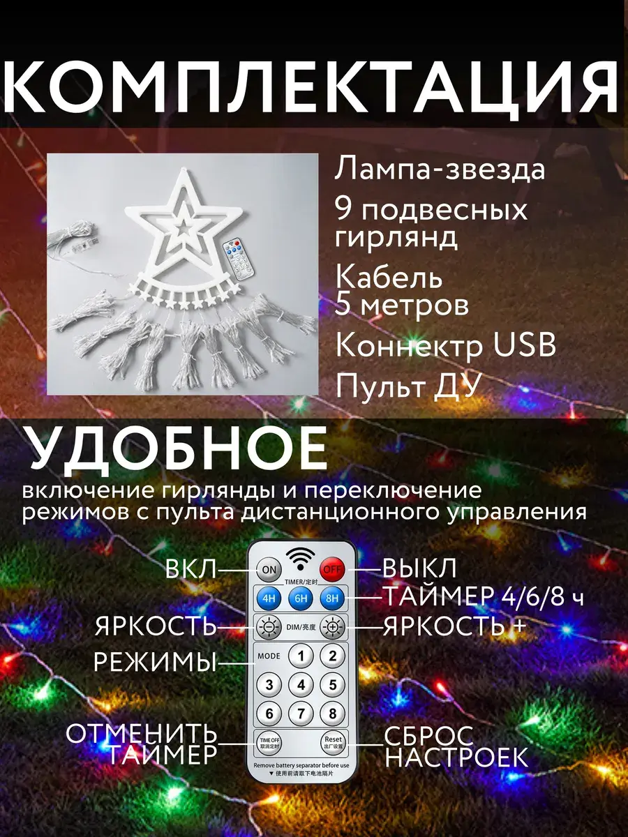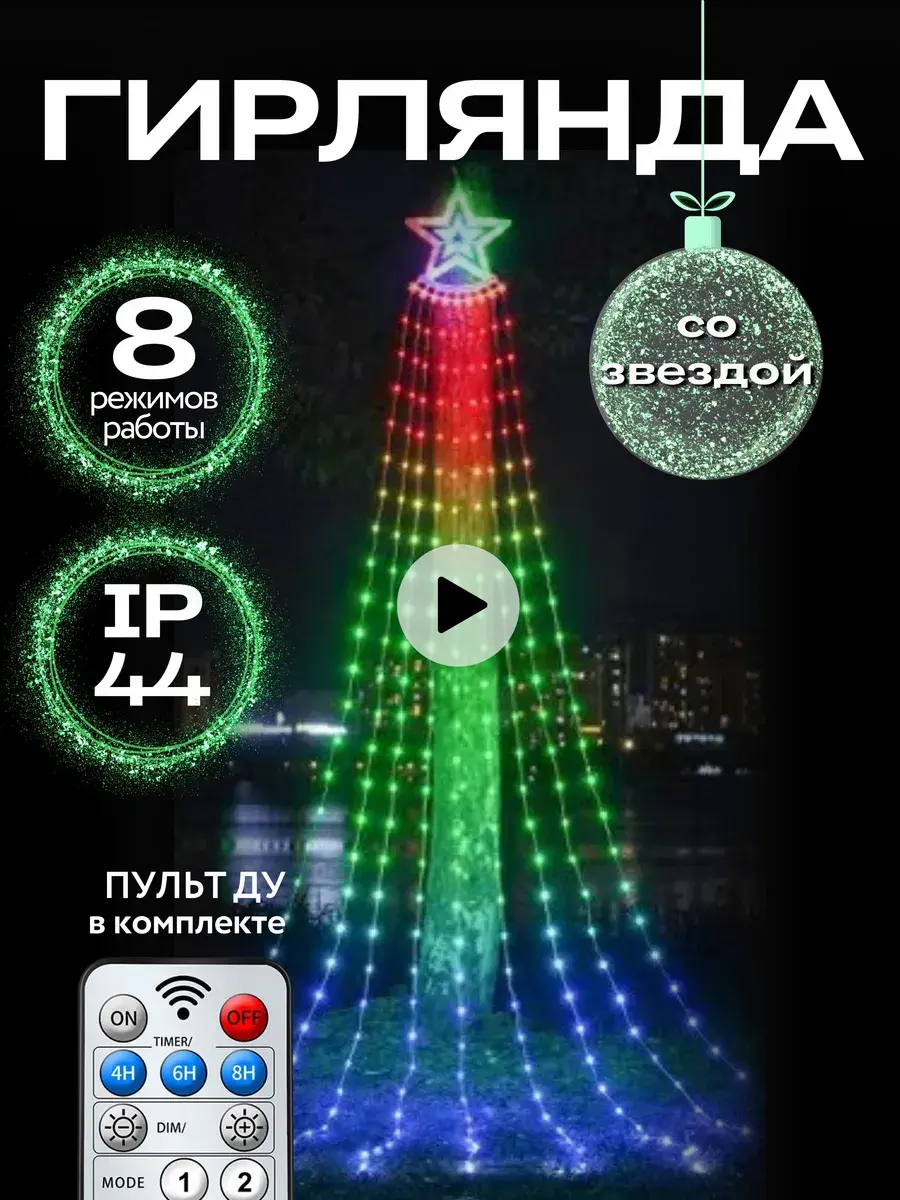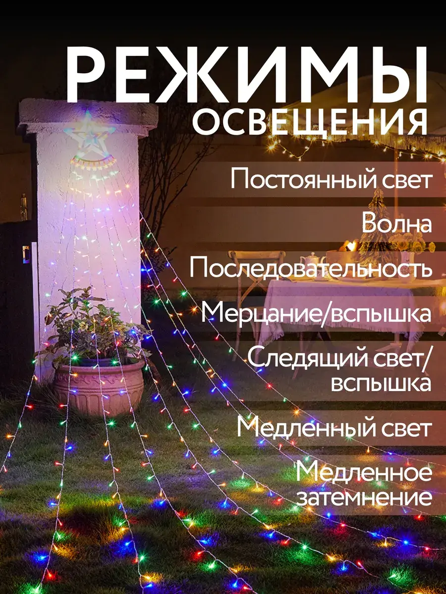 Эта светодиодная гирлянда в виде занавеса создаёт эффект звездопада или водопада прямо у вас дома или на улице. Горизонтальный шлейф с равномерно распределёнными вертикальными нитями из 36 ламп длиной 3,5 метра каждая, дополнен 8 режимами освещения, включая постоянный свет, волны, мерцание и другие. Вы сможете подобрать идеальный режим для своего настроения и стиля оформления. Управляйте гирляндой с помощью дистанционного пульта.
