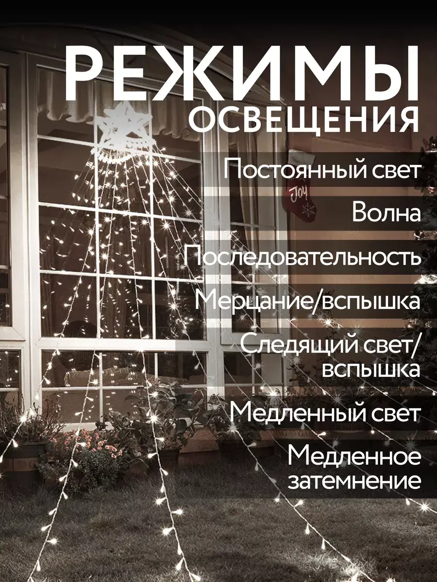 Эта светодиодная гирлянда в виде занавеса создаёт эффект звездопада или водопада прямо у вас дома или на улице. Горизонтальный шлейф с равномерно распределёнными вертикальными нитями из 36 ламп длиной 3,5 метра каждая, дополнен 8 режимами освещения, включая постоянный свет, волны, мерцание и другие. Вы сможете подобрать идеальный режим для своего настроения и стиля оформления.