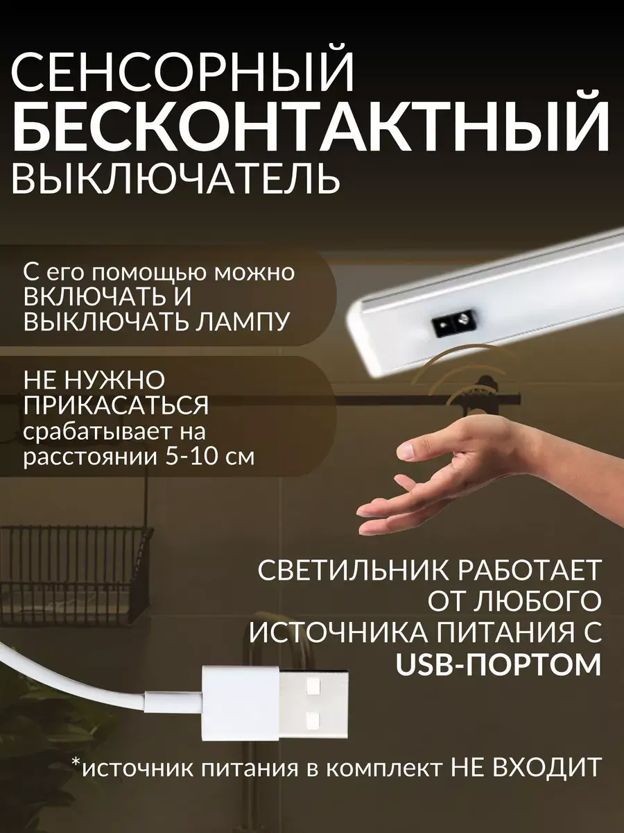 Светильник под шкаф имеет удобный сенсорный датчик вкл/выкл, позволяет не прикасаться к светильнику и реагирует с расстояния 5-15 см на взмах руки.