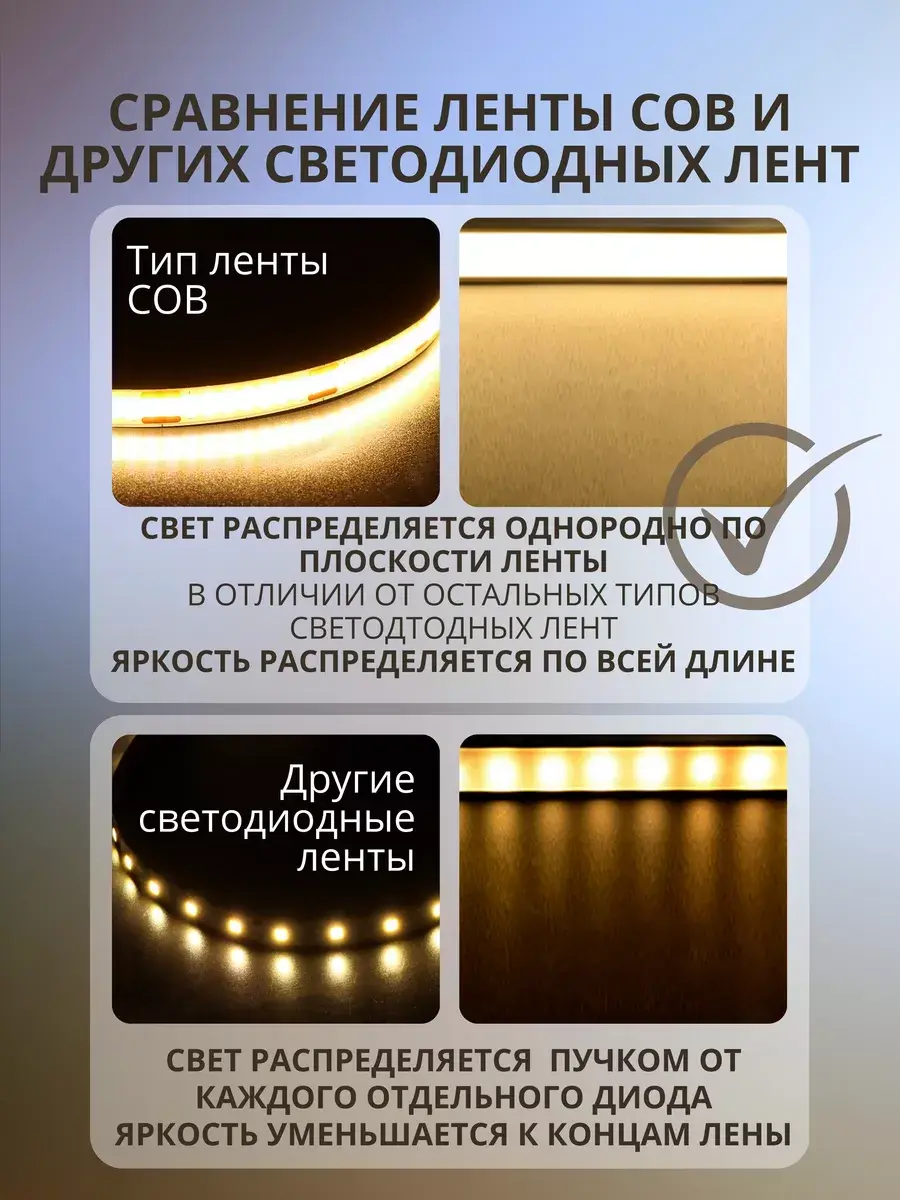 Светодиодная COB-лента - это современное решение для освещения, которое сочетает в себе высокую эффективность и стильный дизайн. Она обладает уникальной технологией COB (Chip-on-Board), которая позволяет создавать равномерное и яркое освещение без мерцания. Расширенный угол свечения - 180°, напряжение питания 5В, минимальная сила тока 2А. Свет без точек, затемнений или пятен, свет мягкий, привлекательный, не раздражающий.