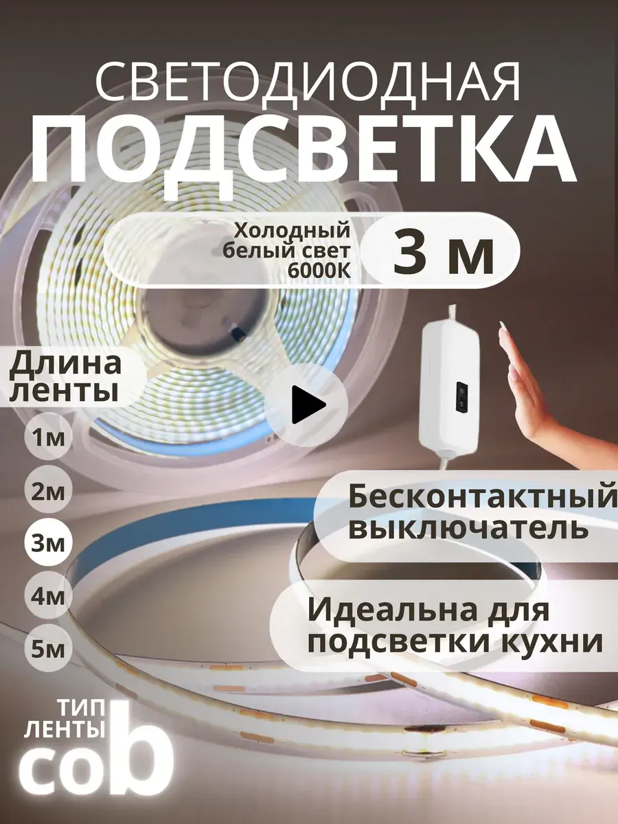 Светодиодная лента COB 3 метра с бесконтактным выключателем создаёт сплошное свечение холодного белого света (6000К), без видимых диодов и точек. Не нужно прикасаться, чтобы выключить и включить свет, достаточно только поднести руку и она включится.