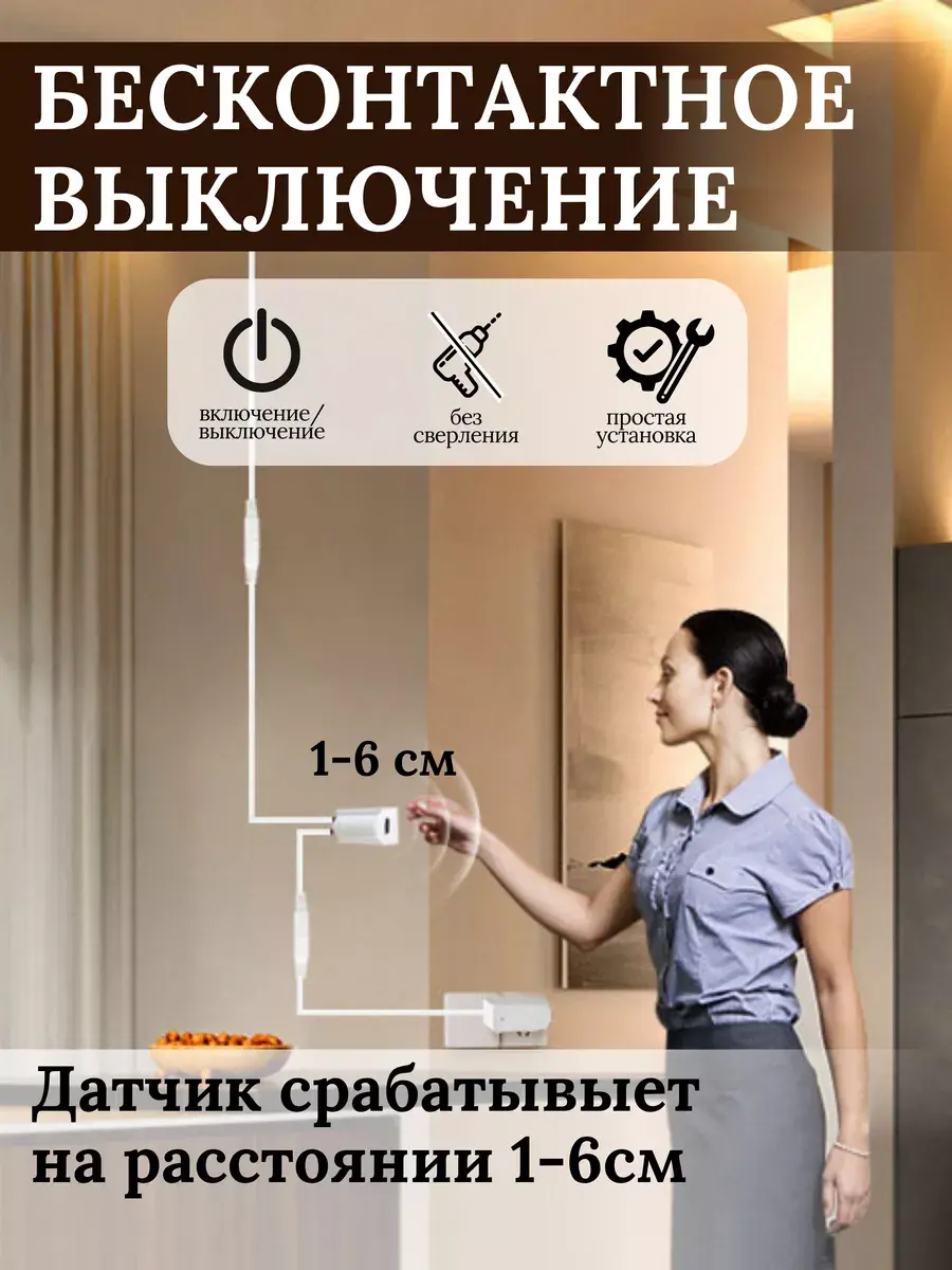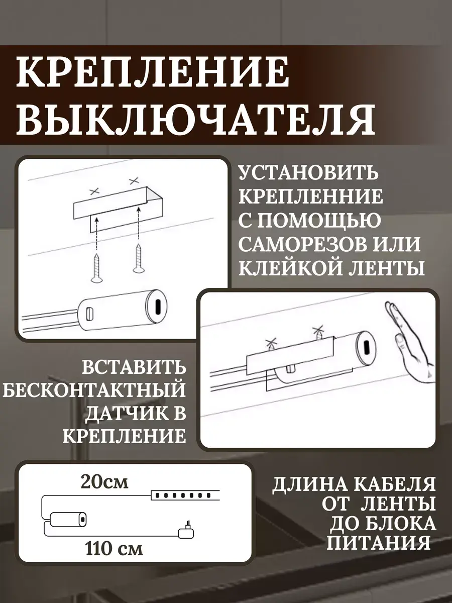 Наслаждайтесь ярким освещением с помощью LED ленты, которая легко устанавливается благодаря клейкой основе на обратной стороне. Бесконтактный выключатель обеспечивает максимальный комфорт использования.Не нужно прикасаться чтобы выключить и включить свет, достаточно только поднести руку и она включится.